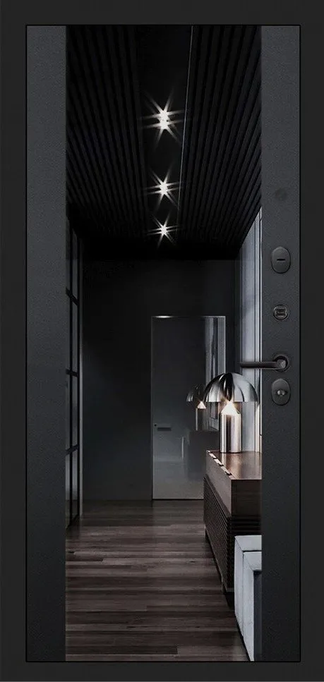 Фурнитура в черном цвете: Броненакладка врезная, накладка со шторкой, глазок , дверная ручка, ночная задвижка. Цилиндр ключ-вертушка Apecs, регулируемый эксцентрик.