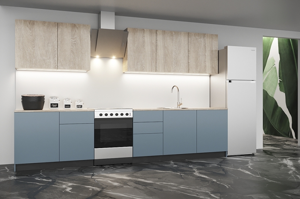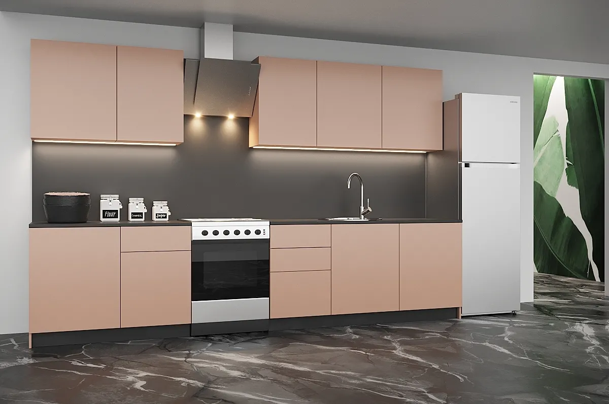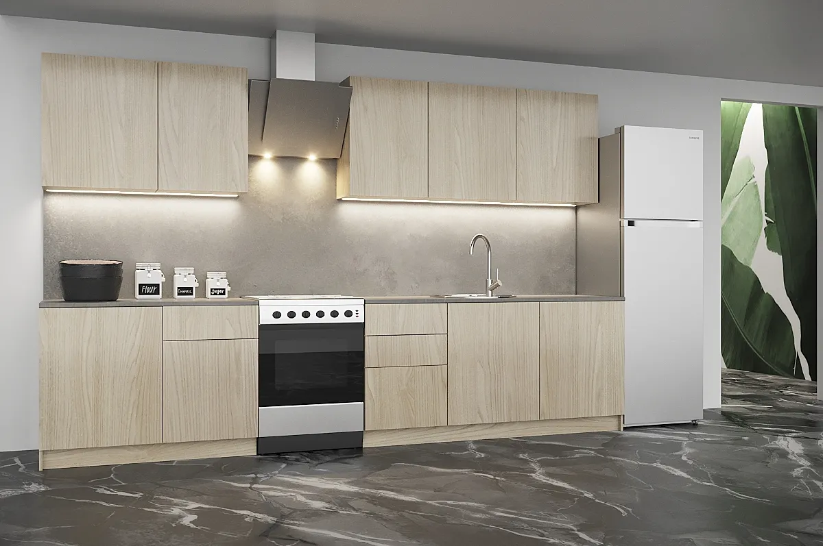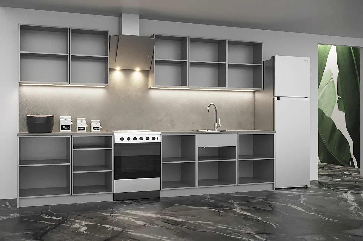 Ручки, столешница, стеновая панель, мойка, смеситель и бытовая техника продаются отдельно.